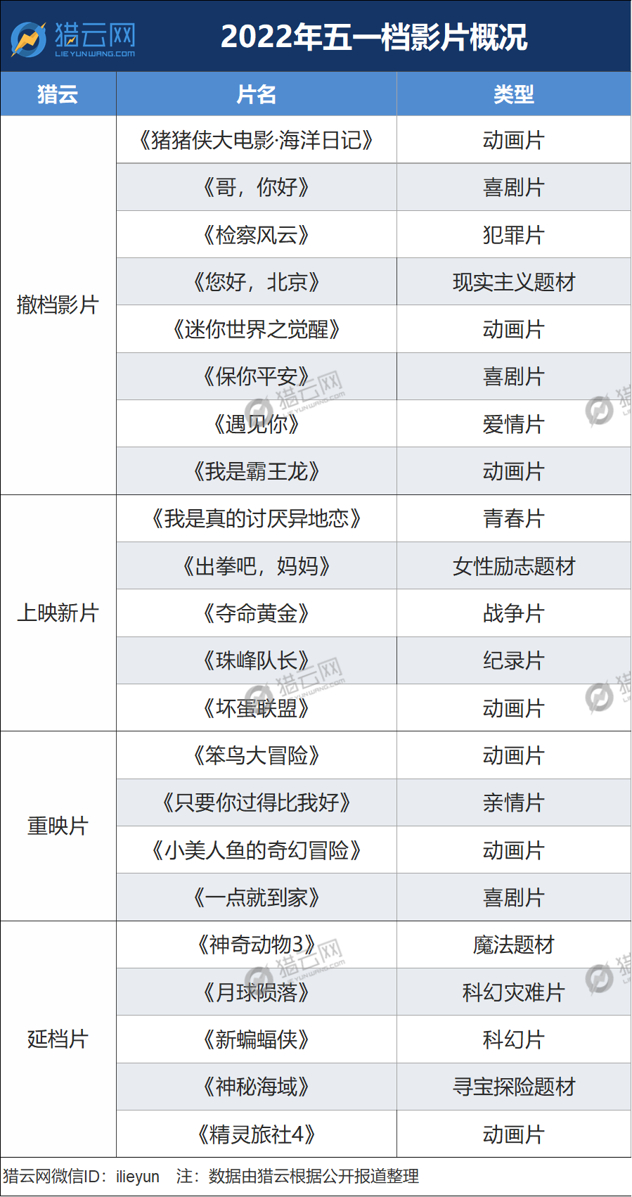 4月18日,《猪猪侠大电影·海洋日记》率先宣布退出今年五一档。随后,包括《哥,你好》《检察风云》《您好,北京》《迷你世界之觉醒》《保你平安》《遇见你》《我是霸王龙》在内的新片,也纷纷撤档。