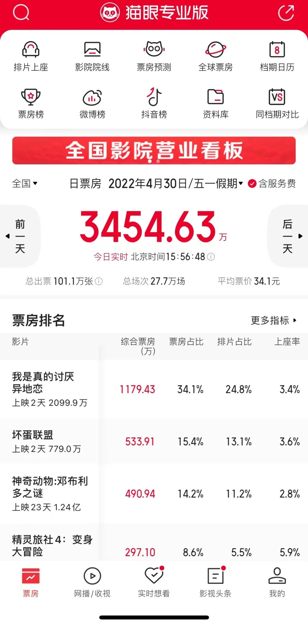截至猎云网发稿前,五一档首日票房只有3454.63万元,而去年五一档首日票房达4.57亿元。