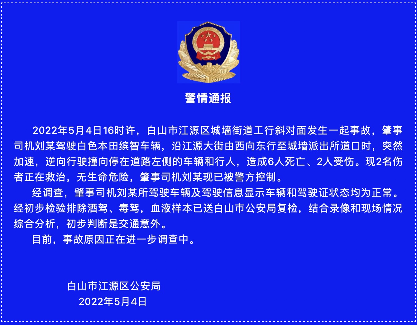 据“平安江源”微信公众号消息,白山市江源区公安局5月4日发布警情通报称,2022年5月4日16时许,白山市江源区城墙街道工行斜对面发生一起事故,肇事司机刘某驾驶白色本田缤智车辆,沿江源大街由西向东行至城墙派出所道口时,突然加速,逆向行驶撞向停在道路左侧的车辆和行人,造成6人死亡、2人受伤。现2名伤者正在救治,无生命危险,肇事司机刘某现已被警方控制。