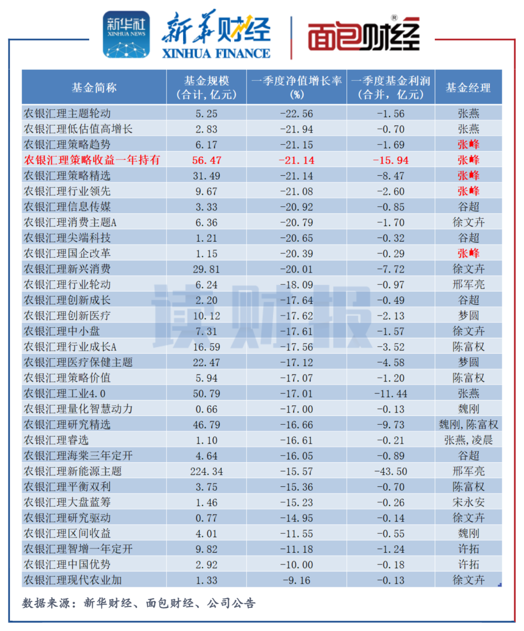 统计显示,农银汇理的权益类产品(灵活配置型、偏股混合型、普通股票型,下同)一季度收益率全员告负,平均收益率约-17.45%。其中,张峰管理的5只产品平均亏损超过20%。