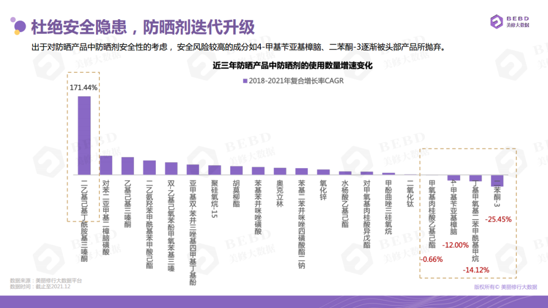 防晒趋势指南显示,如今安全风险较高的防晒剂如4-甲基苄亚基樟脑、二苯酮-3等,已逐渐被头部产品所抛弃。