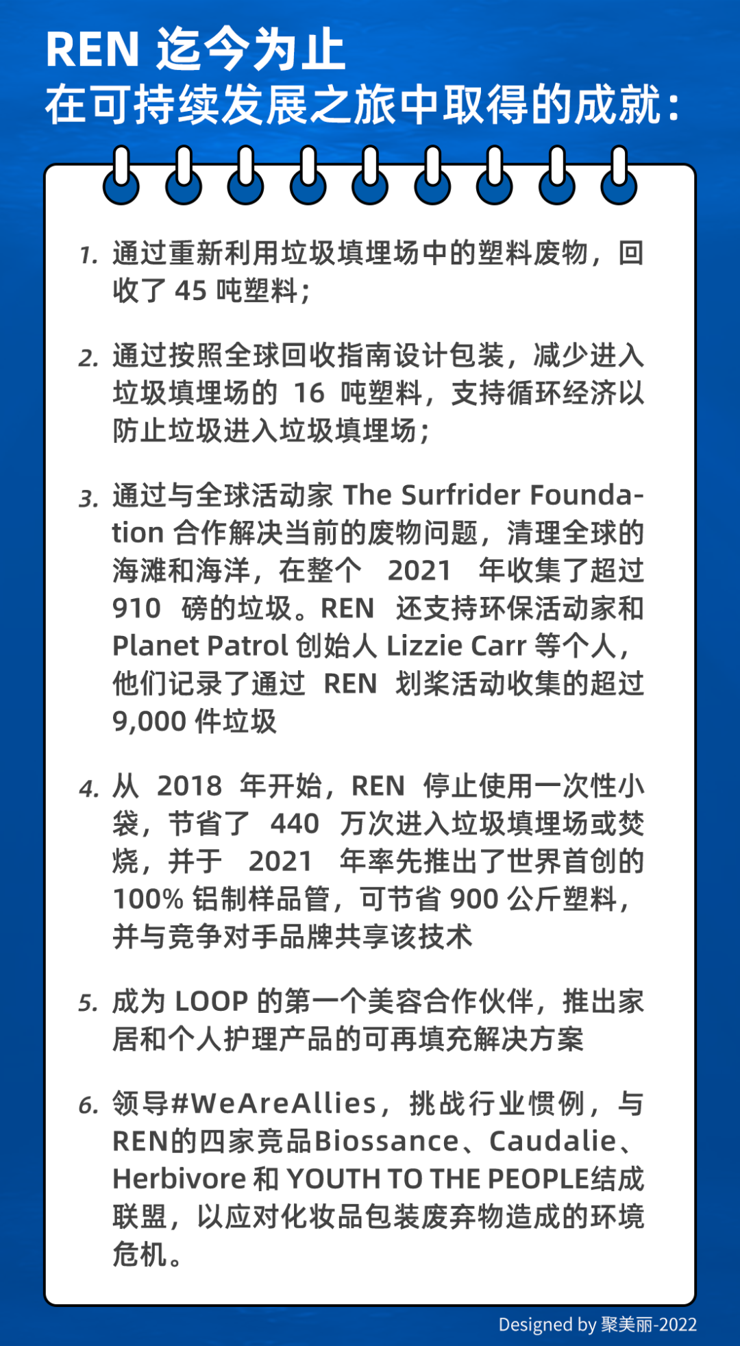 英国护肤品牌REN Clean Skincare使用回收的海洋塑料作为产品包装的材料(用大西洋中收集的塑料生产了首批可回收泵之一),为保护海洋、海浪和海滩,该品牌还在过去两年中一直与 Planet Patrol合作,以帮助收集堵塞水道的塑料。