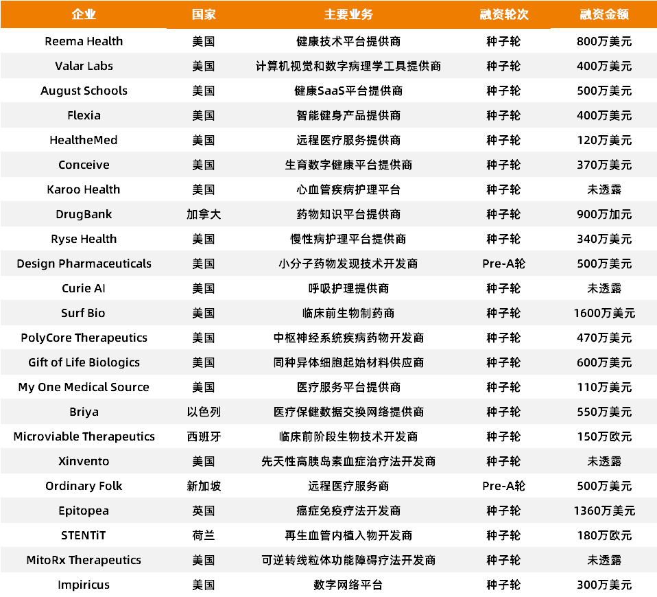根据动脉橙果局不完全统计,在刚刚过去的4月,海外医疗健康领域共发生23起早期投融资事件,融资总额超12亿美元。