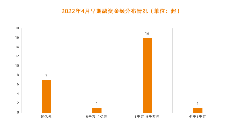 首先在数量上,4月共发生25起早期投融资事件,同比增长39%;其次在金额上,4月早期融资总额超15亿人民币,同比增长15.4%;最后在投资机构数量上,4月共有包括红杉在内的71家投资机构参与早期投资,数量较上月增加了21家。