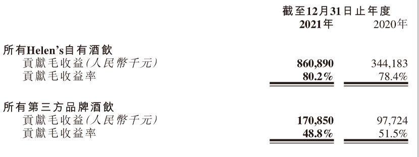 从财报中也可以看出来,海伦司特色产品的毛收益更成为一大亮点,其中海伦司自有酒饮贡献毛收益8.61亿元,毛收益率达80.2%,相比2020年同期的78.4%,再高出1.8个百分点;第三方品牌酒饮贡献毛收益1.71亿元,毛收益率处于较高水平,为48.8%。