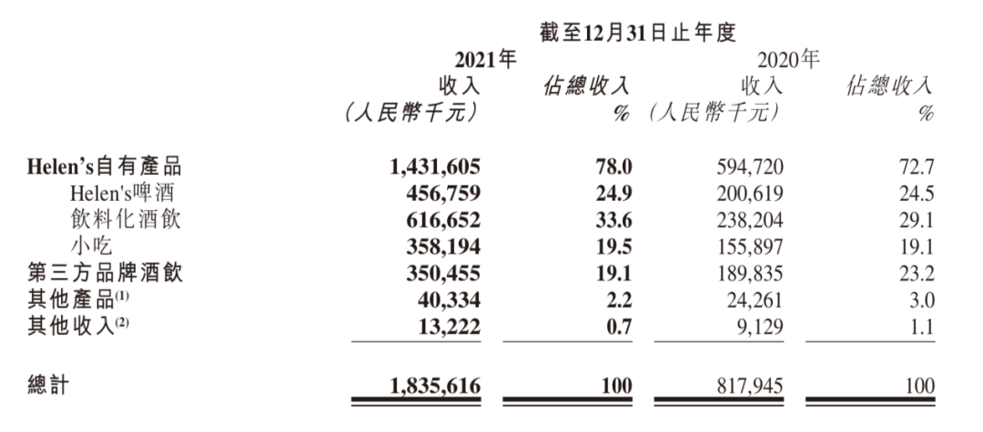 细分到产品上,海伦司自有产品收入14.32亿元,在总收入中占比78%,较去年同期占比提升5.3个百分点。其中,饮料化酒饮收入6.17亿元,占年度总收入的33.6%;海伦司啤酒收入4.57亿元,占年度总收入的24.9%;小吃收入3.58亿元,占年度总收入的19.5%。