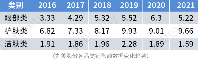 从历年财报公布的数据分析,丸美的产品线其实一直很先进,以眼部产品为切入口,占领消费心智,然后体系化拓展水乳膏霜和面膜各品类,整体呈“雁阵”扩张。