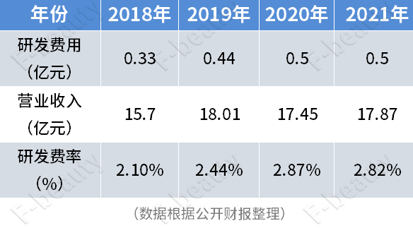 而其所有的产品背后,又以“水解弹性蛋白”这一核心成分作为支撑,科技力凸显。从2007年丸美第一代弹力蛋白眼精华问世,至今已经进行了5次升级。数据显示,丸美股份在研发上的投入一直比较稳定,研发费率保持在2%到3%之间,随着营业收入的增长,投入金额持续增加。