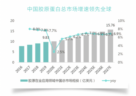 根据 GrandView Research数据显示,2019年中国胶原蛋白市场规模约为63.7亿元,占比全球市场 6.40%。预计2027年,中国胶原蛋白市场将高达 201亿元,占比全球市场 6.96%。我国胶原蛋白总体市场规模增速高于全球。
