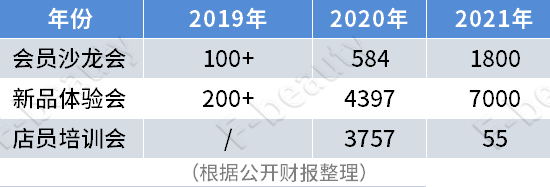 如果线上是丸美股份寻求高增长,跑马圈地的“牧场”,作为中高端品牌,线下就是丸美的“根”。财报显示,丸美在大力投入希望能突破线上渠道的同时,对线下渠道的投入也在持续增加。数据显示,从2019年到2021年,其线下沙龙会的举办场次增加了10倍,新品体验会的场次增加了35倍。