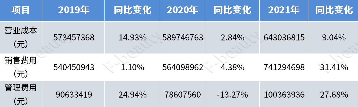 从财务指标看,导致丸美“破功”的核心指标是销售费用和管理费用的增加。同比2020年,销售费用增加了31.41%,管理费用增加了27.68%。