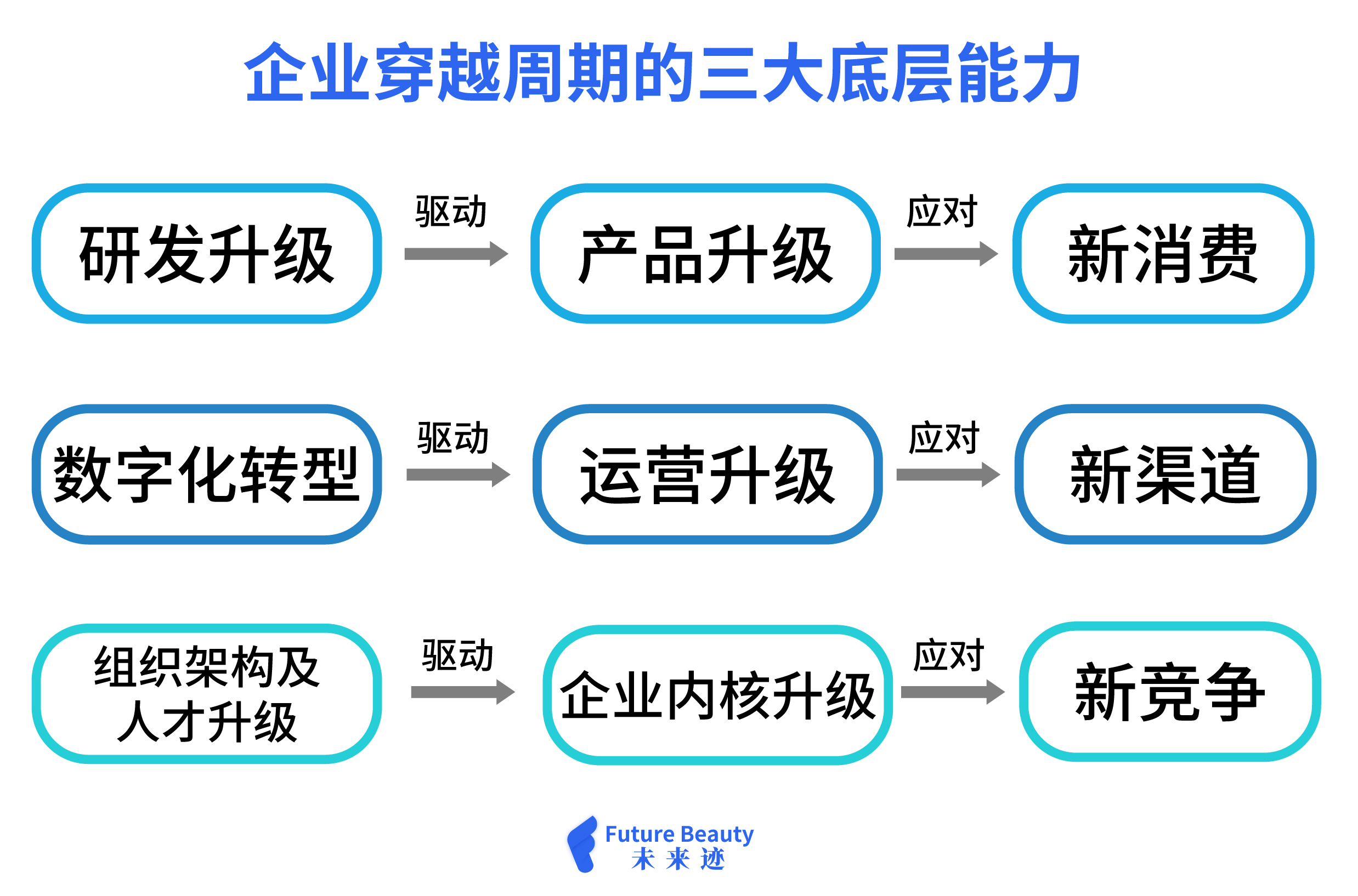 从珀莱雅和御泥坊走过的历程分析,其穿越周期的核心可以归结为“三大底层逻辑的升级”。