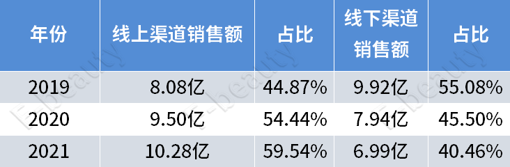 2018年前后,当大部分国货品牌开始疯狂拓展线上渠道时,丸美一直比较克制。这也为其在线下渠道赢得了不少的好感,当门店纷纷精简SKU,只挑选各大品牌的畅销单品做陈列时,很多线下门店选择了将丸美全系列产品留下。时至今日,在《未来迹Future Beauty》开展的多省CS渠道调查中,多位门店老板都表达了对丸美品牌引流价值和回购率的肯定。但或许也正因此,其线上开拓速度一直不快,直到2020年其线上份额才首次超过线下,相对来说比其它企业要晚差不多一年。