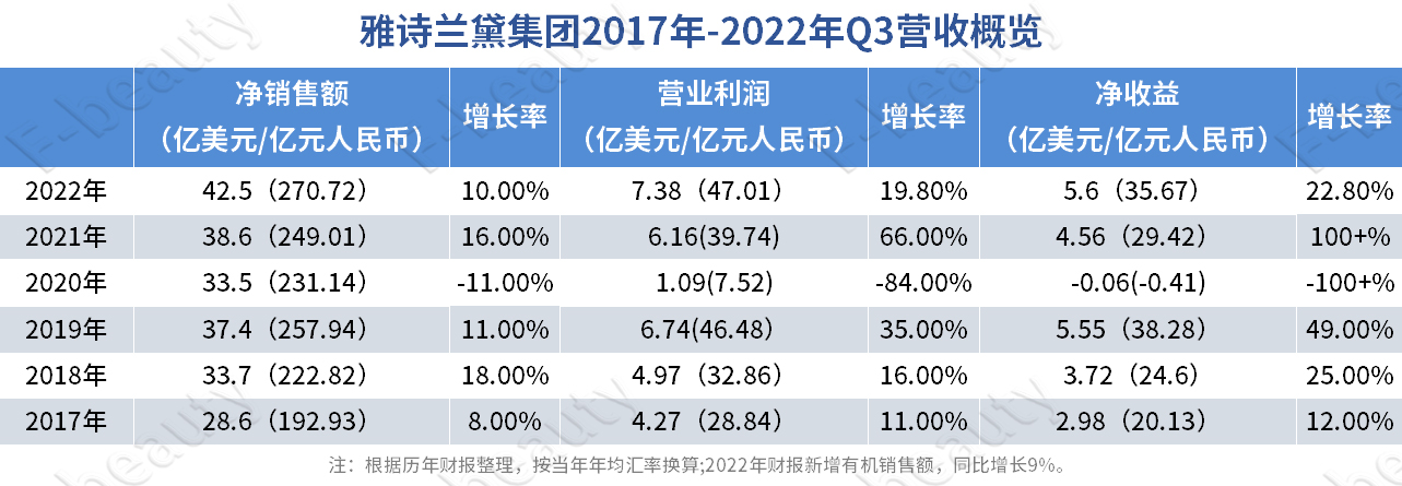 5月3日,雅诗兰黛集团发布2022年第三季度财报,显示该财季集团净销售额为42.5亿美元(约合人民币270.72亿元),同比去年同期的38.6亿美元增长10%,排除品牌重组和汇率等因素影响的有机净销售额增幅为9%;营业利润增长至7.38亿美元(约合人民币47.01亿元)同比增长19.8%。