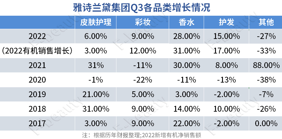 根据财报,在海蓝之谜和倩碧两位数销售增长的带动下,本季集团皮肤护理类销售额为23.59亿美元(约合人民币150.27亿元),同比增长6%,有机增长3%;由于奢侈品香水的高溢价、实体零售的开放以及西方市场旅游业开始复苏,香水类产品净销售额增长28%,有机增长31%,达到5.79亿美元(约合人民币36.88亿元)。
