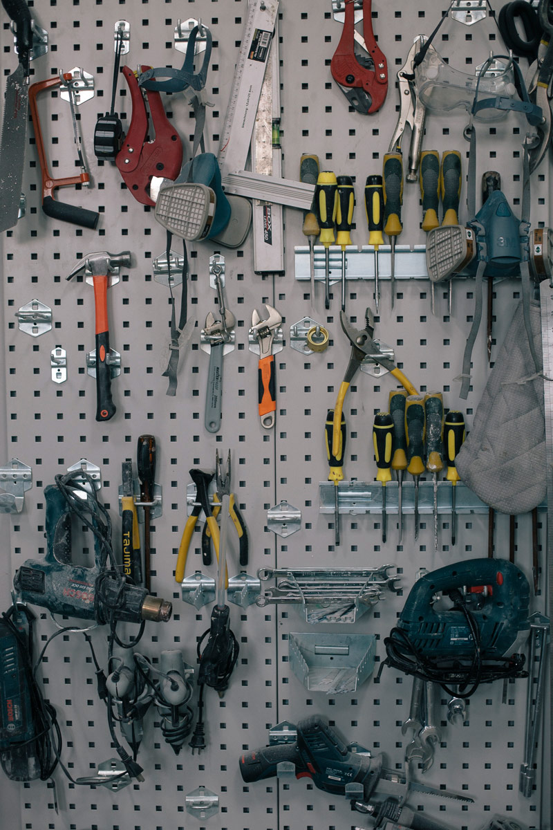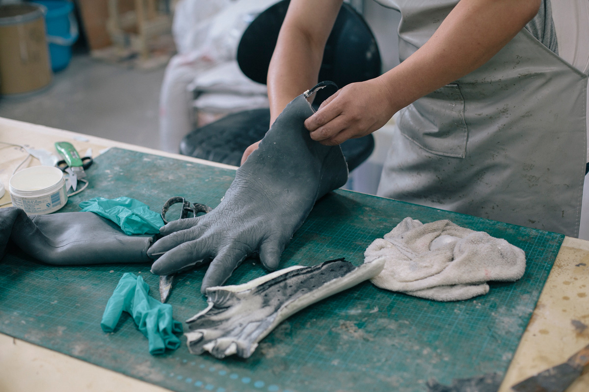翻石膏的模具制作车间里,挂满工具。负责模具制作的是王文进师傅,他平时不大爱说话,天天翻模。加入光泽作用工作室前,王师傅在横店剧组做过6年的模具和特殊道具,主要做古装戏的兵器及陈设。如今做特效模型,材料和工艺都要求更高,翻模的细节也更多。