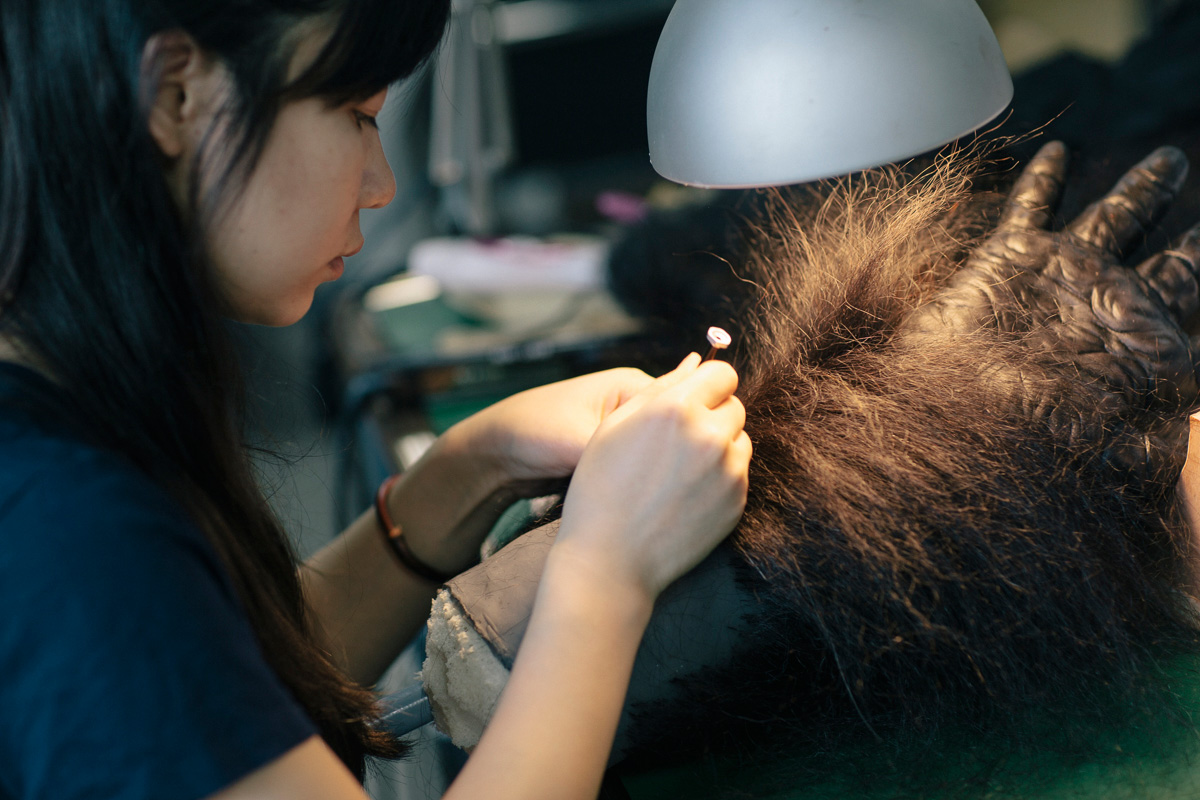 小菇(袁琛)为猩猩手臂植发。特效模型在未来使用中可能有很大的动作,譬如猩猩可能需要手臂撑地行走,设计时,皮子的厚度和弹性、毛发固定程度就都要考虑进去。这只猩猩设计成长毛的,小茹把人工毛发缝到布上,做成一套衣服。