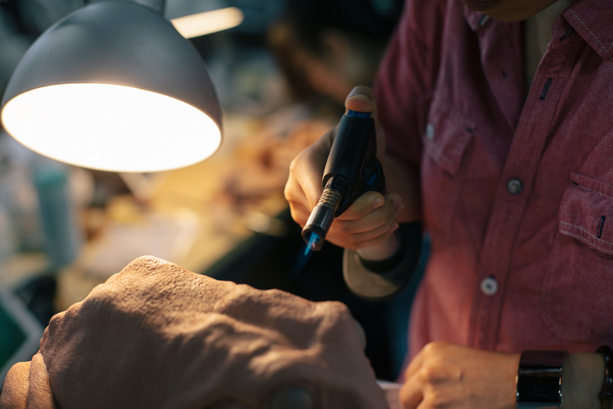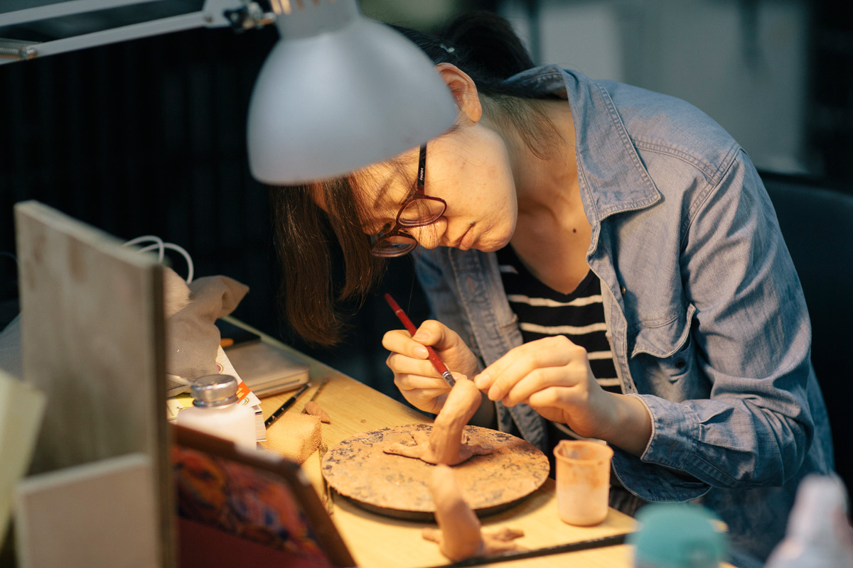 韩昊楠用瓦斯火枪,烧雕塑表面,让泥变光滑,能制作出更丰富的纹理细节。