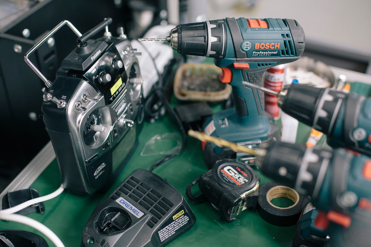 几把手电钻,和控制模型运动的机械遥控器。