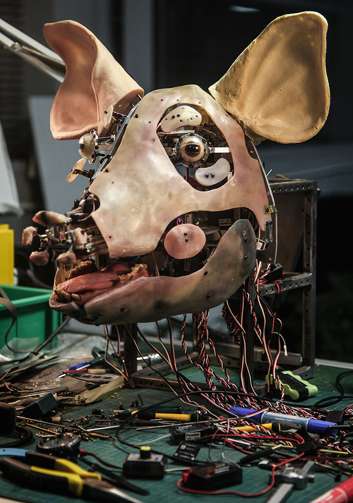 在机械难度上,个儿越小的道具往往越难——小猩猩就比大猩猩难,图上的这只猪头也难,“主要我们把它做难了,因为它动作太多了。像猩猩是26个舵机,这猪已经34个舵机了,又多了8个,要细分的话得四个人去遥控它。而这个猪头的耳朵可以前后摆动,鼻子能动出五个方向,眉弓、嘴、舌头都能动。” 他们打算用这个猪头拍个视频,带它到菜市场去逛一圈,以假乱真。