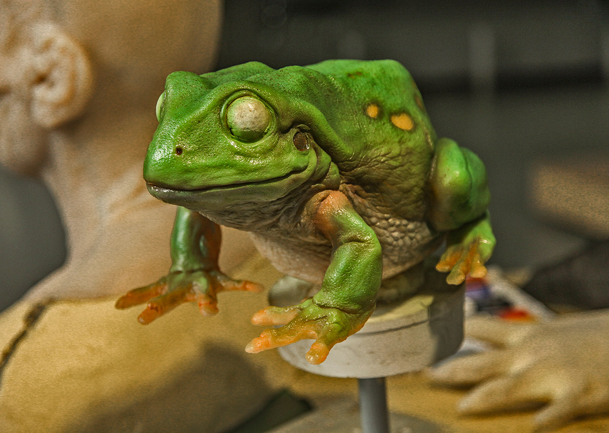 为雕这只青蛙,雕塑师韩昊楠研究了几百张澳大利亚绿树蛙的细节图。她发现,雕青蛙模型的关键,在于逼真再现它皮肤上的点状肌理。