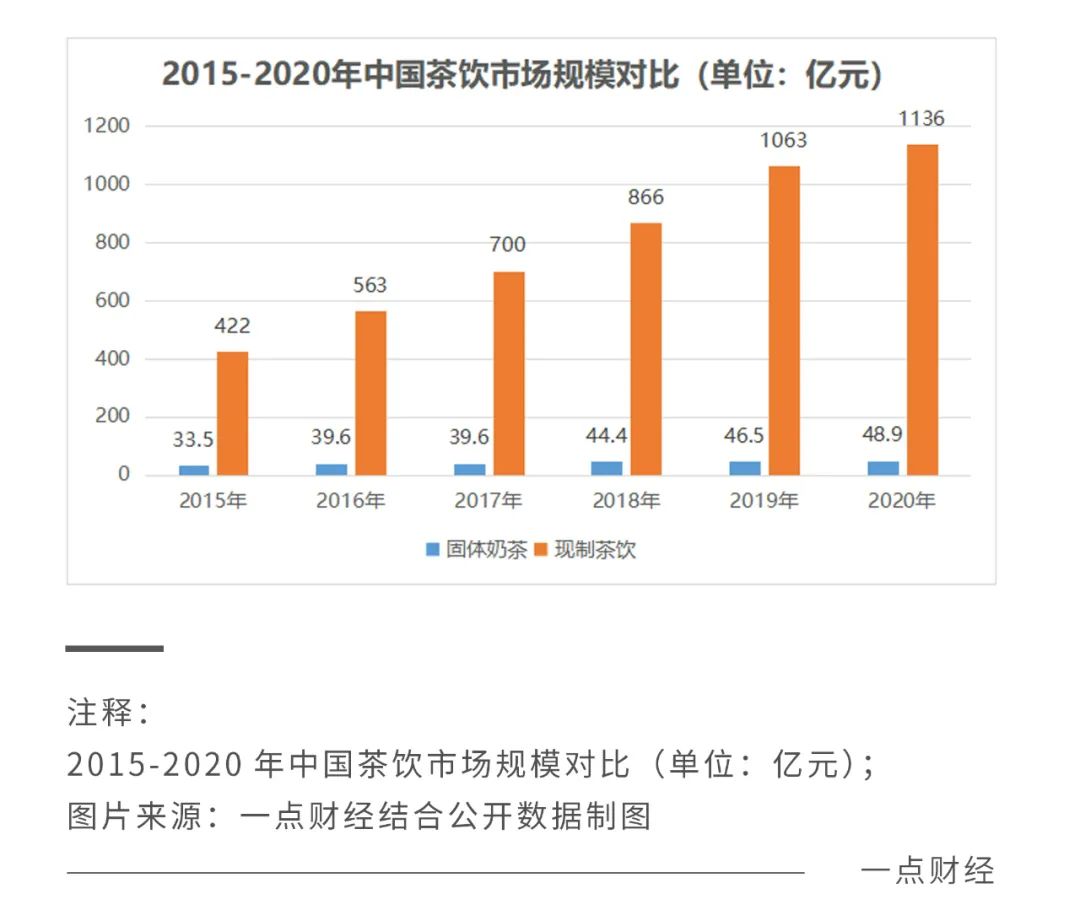 2020年我国现制茶饮市场规模达1136亿元,而同期固体奶茶行业市场规模为48.9亿元,二者在份额和增速上,可谓是高下立见。