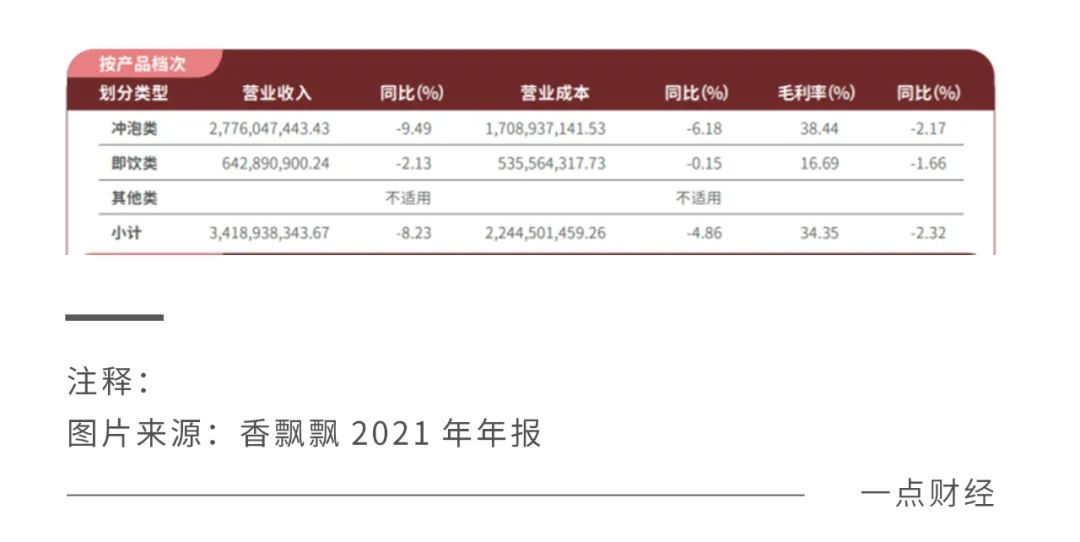 且不说即饮类业务与去年同期相比的下滑态势,单从其2021年的表现来看,“低占比+低毛利”的组合很难为香飘飘带来新的增长突破。
