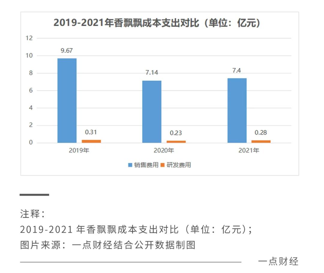此外,重营销轻研发,亦是导致香飘飘产品战力不足的主要原因。2019-2021年三年间,香飘飘销售费用为9.67亿元、7.14亿元和7.40亿元,而研发费用分别为3103万元、2342万元和2805万元,不及销售费用的零头。