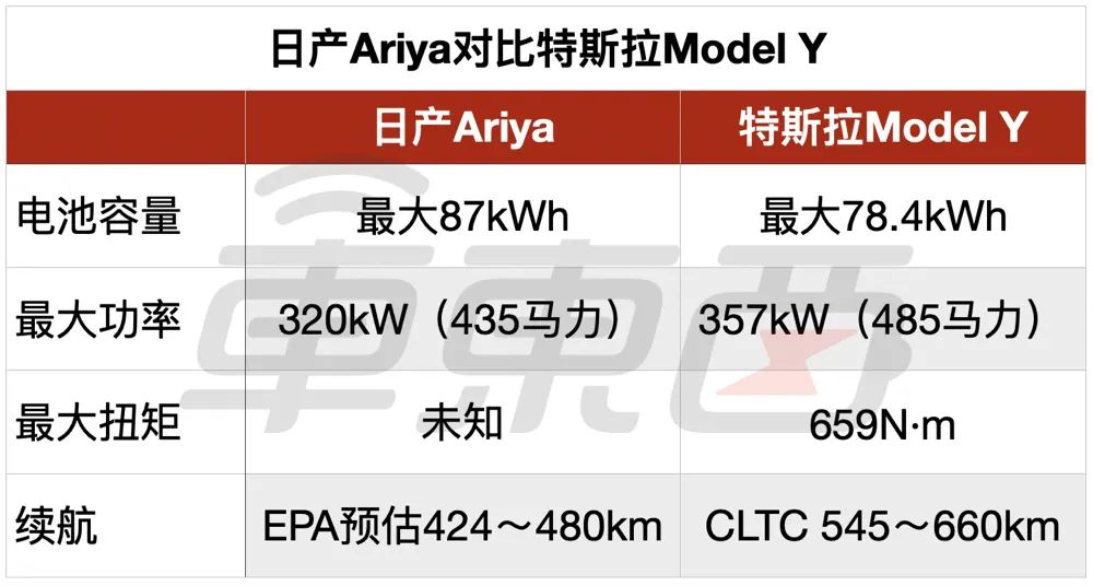 此外,东风日产Ariya的高配车型拥有87kWh容量的电池,相比特斯拉Model Y高性能版多了8.6kWh,车重却多出了200kg。在百公里加速性能上,日产Ariya也将有一定程度下降。也就是说,日产Ariya本想做一款动力、续航全面对标Model Y的车型,但实际却没能在参数上占优。