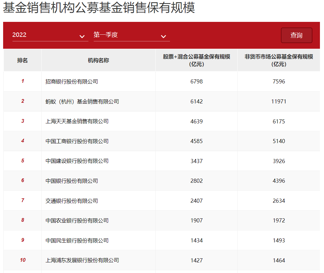 非货币市场公募基金保有规模百强榜单中,蚂蚁(杭州)基金销售有限公司位列榜首,高达11971亿元,招商银行次之,也有7596亿元。上海天天基金销售有限公司保有规模6175亿元,排名第三。