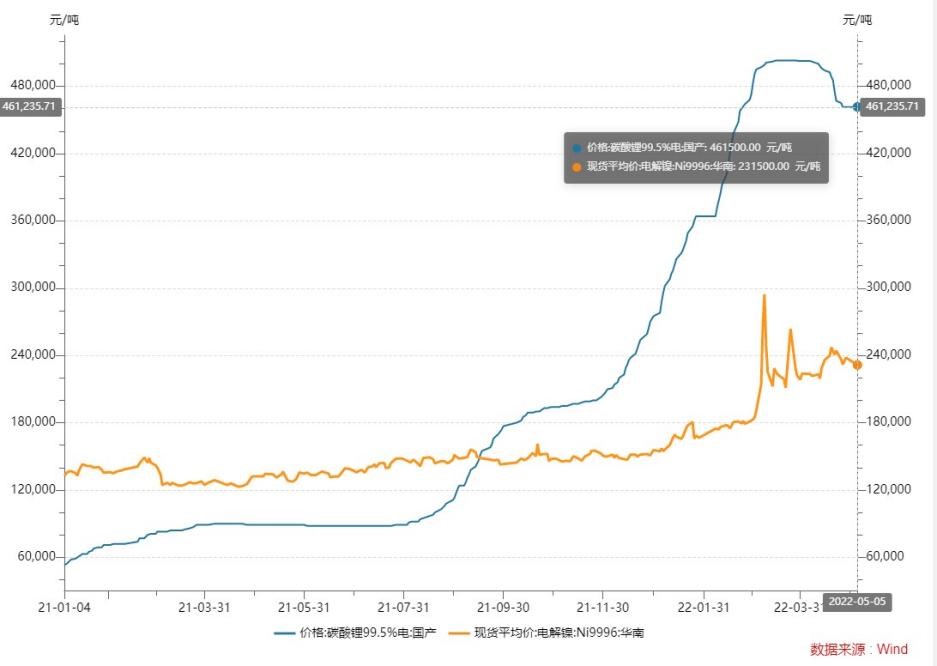 在俄乌冲突背景下,国内镍价格极为显著。据Wind数据,截至5月5日,电解镍价格突破23万元,现报价23.15万元/吨,较2021年初的13.45万元上涨72.12%,较今年初的15.47万元上涨49.69%。