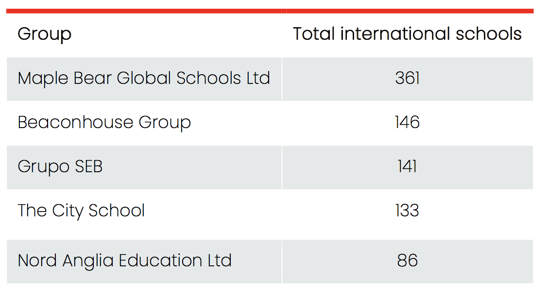 ISC数据显示,截至今年3月,就拥有或管理的国际学校数量来看,全球国际学校市场中排名前五位的学校集团分别是:枫叶小熊、灯塔学校系统、Grupo SEB、The City School和诺德安达教育集团,所拥有或管理的学校数量分别为361所、146所、141所、133所和86所。