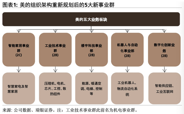 从美的最新财报看,美的构建了智能家居事业群、工业技术事业群、楼宇科技事业部、机器人与自动化事业部和数字化创新业务五大业务板块。