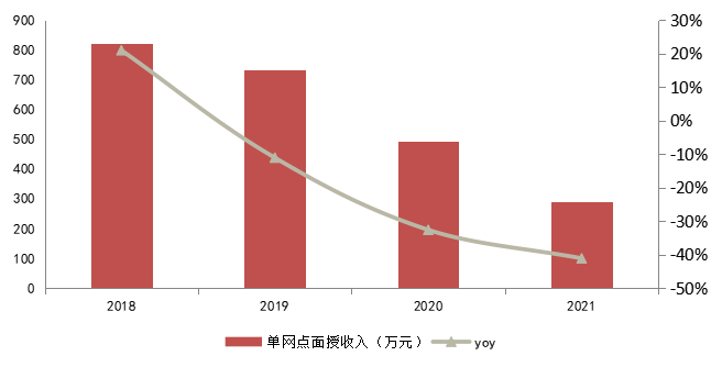 单网点收入在下滑,而刚性的成本却在上升,最终结局就不难猜测,自然是报表的全面溃败。根据最新的财报,公司的毛利率腰斩,并最终酿成2021年24亿元的净亏损。