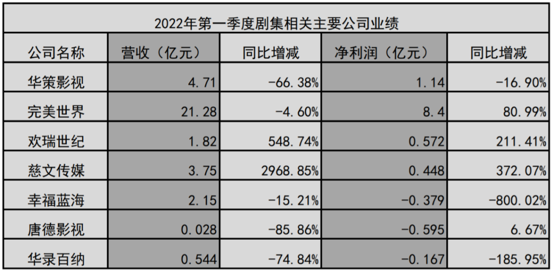 在这种环境下,今年一季度剧集相关公司的财报业绩或许值得进一步关注。应该看到,这些在2017年以前影视公司上市潮的弄潮儿们,有一些先后出现了坏账、亏损、内容积压等问题;而如华策影视,今年一季度刚刚上线《与君初相识》,仍具有行业头部的影响力。整体来看,这些公司提供了较为多元化的观察模板。