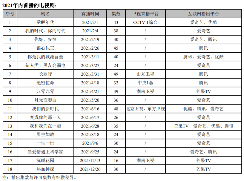 2018年以来,影视行业进入深入调整阶段。从生产方面来说,根据国家广电总局,2021年全国生产完成并获得发行许可的剧集共194部6722集,而2018年至2020年的数据分别为323部13726集、254部10646集、202部7476集,产量连续三年下降。