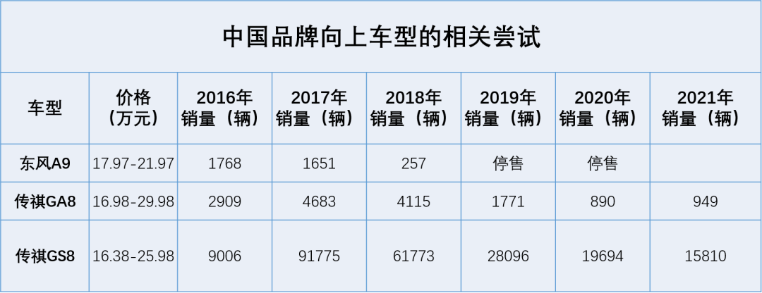 直到2016年底,中国品牌的向上尝试才终于有了些成绩,而这些成绩还要感谢SUV市场。2016年10月,定价16.38-25.98万元的中型SUV传祺GS8上市,这款车一经推出后马上受到追捧,月销量一度破万,如此销量表现甚至让官方都有些措手不及。
