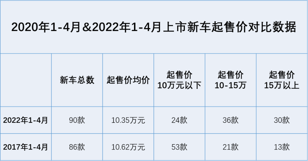 2022年1-4月,中国品牌在乘用车领域共推出90款新产品,各产品入门车型平均售价已达到14.35万元,其中起售价在10万元以下的车型仅有24款,15万元以上车型则高达30款。可以说,在经过5年的努力后,中国品牌形象已得到极大改善,逐渐撕掉了以往的“廉价”标签。
