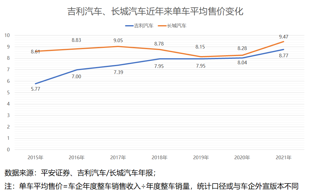 5年提升3.73万元,这一数字看上去并不起眼,但在头部中国品牌车企看来,这是用无数血汗,无数次试错教训换来的。以吉利汽车为例,2015-2021年间,该企业用了7年努力,才把单车平均售价提升了3万元。