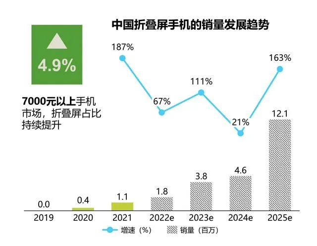 赛诺还预测,随着价格的下探,2022年折叠屏的销量可能上升到180万台,到2025年甚至突破1200万台。