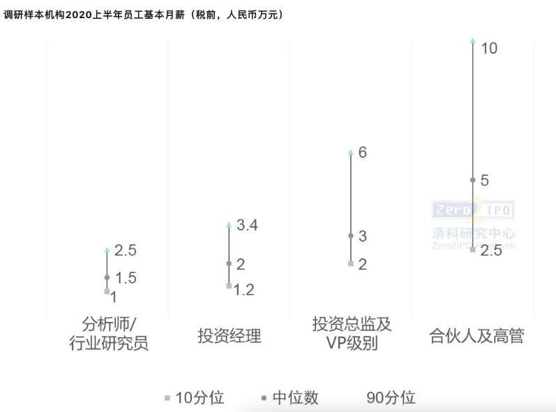 清科研究中心曾在去年发布了《2020年VC/PE机构薪酬与运营机制调查研究报告》,报告显示,VC/PE机构里各职级中等工资水平(中位数)分别为:1.5万元(分析师/研究员)、2万元(投资经理)、3万元(投资总监)和5万元(合伙人及以上)。