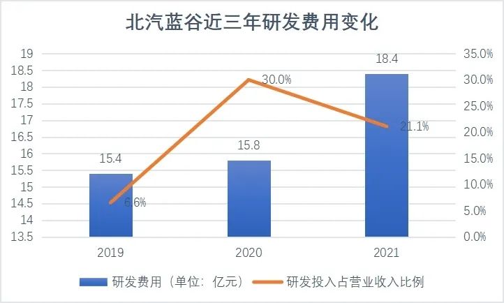 新能源车企十分重视研发投入,如蔚小理三家在近三年的累计研发投入分别为115.08、79.1、55.55亿元。虽然北汽蓝谷在研发投入占比出现大幅上涨,但主要原因是2020年后销量大幅下滑导致营收下滑所致,实际数值变化较小。