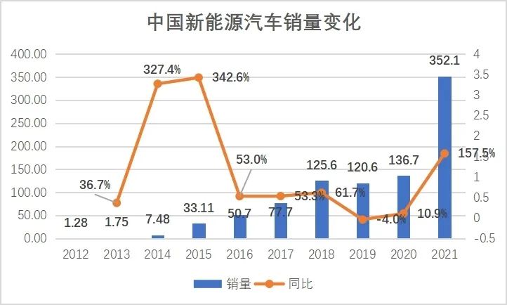 我们观察近十年国内新能源销量变化不难发现,市场真正崛起的时间其实是在2021年,即使在2014-2015年有过惊人的同比增长,但也在2016年后保持50%上下的增长速度,甚至在2019年汽车市场下滑的过程中出现了负增长。