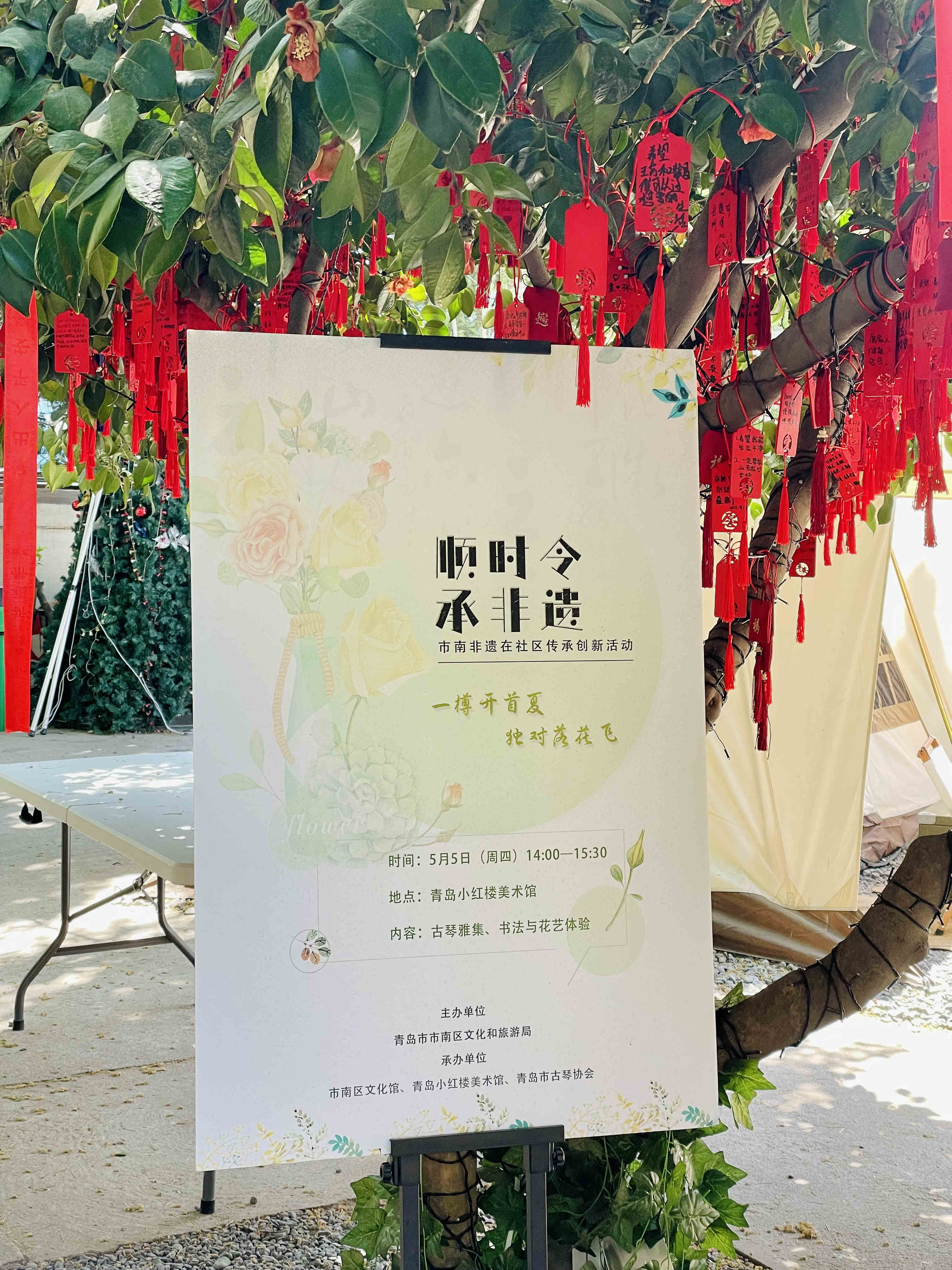 “槐柳阴初密,帘栊暑尚微”。2022年5月5日,大地步入立夏。春离去,夏将立,昼长日暖,荷生蝉鸣,万物如期赴约,“青文驿”(青岛市市南区文化驿站)的“顺时令·承非遗”24节气传承创新活动也没有缺席。两场“非遗在社区节气活动”分别在小红楼美术馆、青岛市古琴协会如期举行。本次活动由青岛市市南区文化和旅游局主办,市南区文化馆、青岛市古琴协会儒风古琴、小红楼美术馆、如上书院承办。