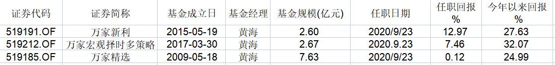 公开资料显示,黄海有近20年的证券从业经验,先后就职于申银万国证券、华宝信托、中银国际证券等公司,2015年4月进入万家基金,目前担任公司副总经理、投资总监、基金经理。