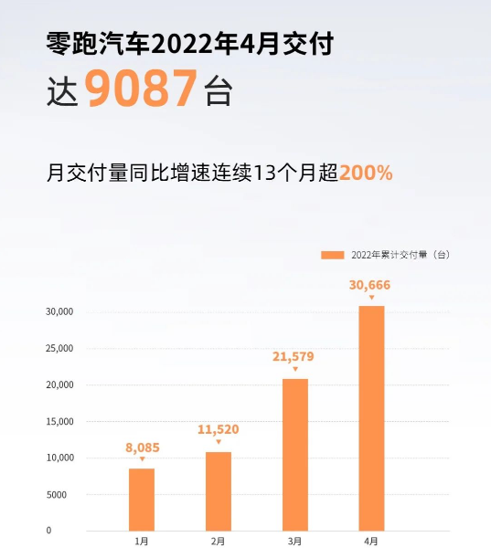 相比之下,主要面向三四线城市,且旗下工厂也不在疫情重灾区的哪吒和零跑,面临的压力明显要小很多。哪吒汽车4月份终端累计交付量8813辆,同比增长120%,环比下滑26.7%。而在市场一直较为低调的零跑汽车,也凭借着“9087辆,同比增长228%”的成绩,以高出小鹏汽车85辆的微弱优势,直接爆冷夺得4月造车新势力销冠。
