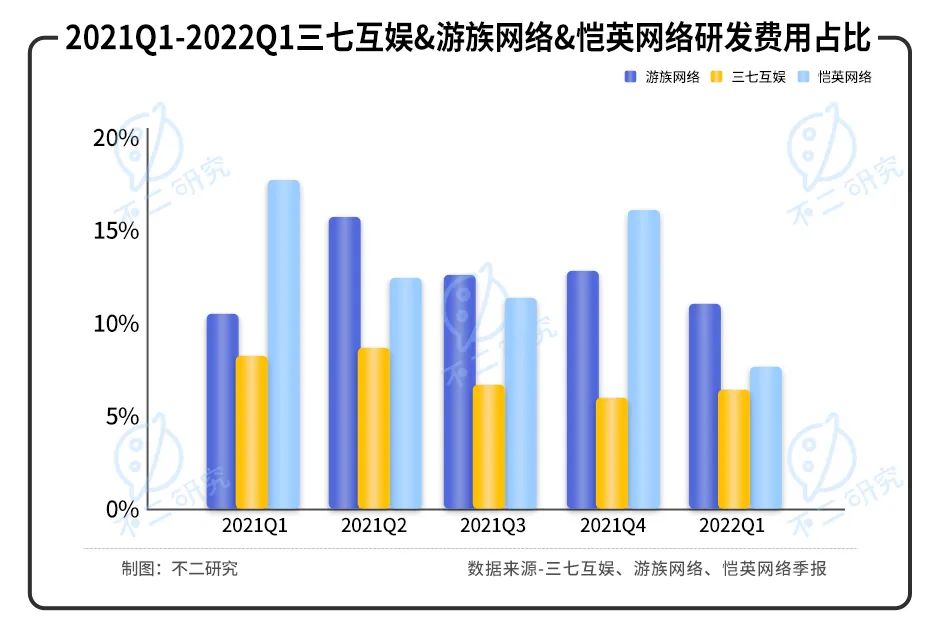 季报数据显示,2021年Q1~2022年Q1,游族网络研发费用占总收入比重分别为10.06%、15.80%、12.85%、12.90%和10.83%;三七互娱研发费用占总收入比重分别为8.51%、9.38%、6.96%、6.31%和6.75%;恺英网络研发费用分别为17.78%、12.59%、11.33%、16.69%和8.16%。三家公司研发费用占比均呈现下降趋势,研发费用对业绩的压力得到释放。