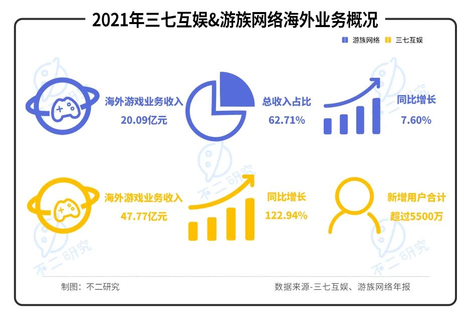 三七互娱的海外业务同样再创新高。根据2021年年报,三七互娱海外游戏业务收入47.77亿元,较上年同期增长122.94%;新增用户合计超过5500万,最高月活用户超过850万。