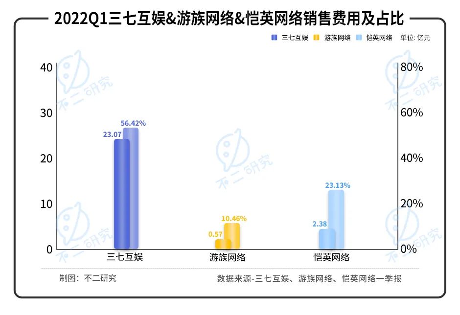 2022年一季度,三七互娱销售费用为23.07亿元,占总收入比重56.42%,仍维持较高占比;恺英网络和游族网络的销售费用占比则较为合理,分别为2.38亿和0.57亿元,占总收入比重为23.13%和10.46%。
