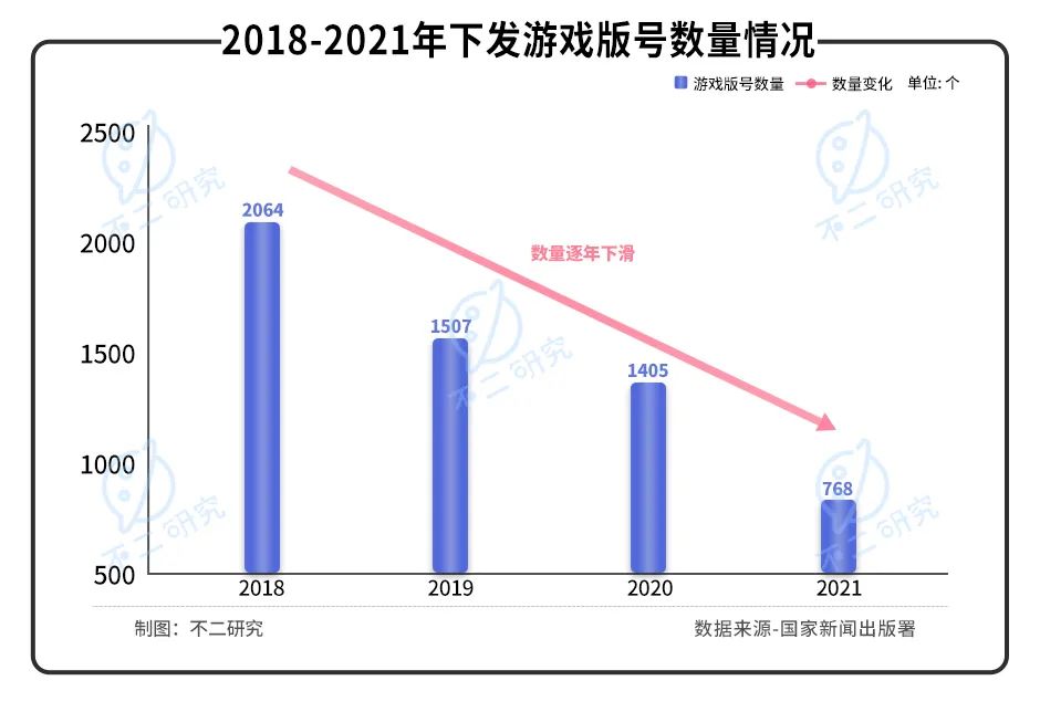 此番恢复版号也并不意味着形势的扭转。根据国家新闻出版署,2018年~2021年,下发的游戏版号分别为2064个、1507个、1405个和768个,数量逐年下滑。今年版号重启后首批45个游戏版号,比2021年月均64个减少近30%。此外,此次拿到版号的游戏公司多是中小厂商,腾讯、网易等国内游戏巨头并不在名单之列。